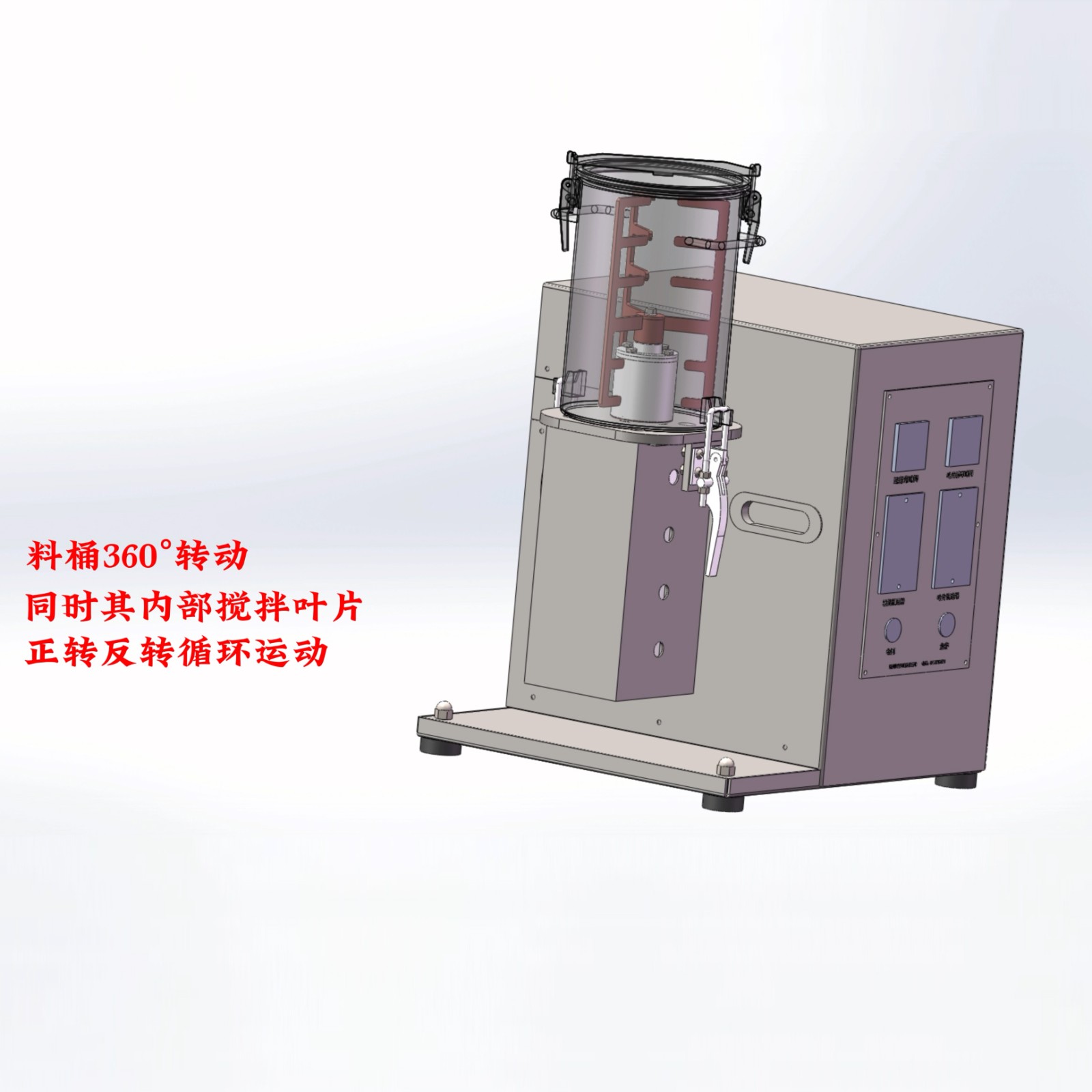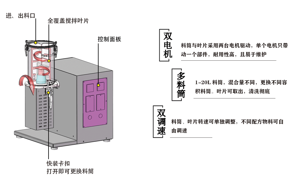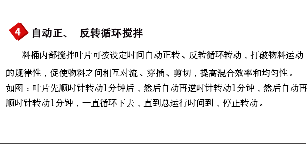 料桶360°翻轉(zhuǎn)運動(速度可調(diào)),且料桶內(nèi)部設(shè)置有攪拌葉片(速度可調(diào)),料桶翻轉(zhuǎn)使物料在混合時無死角;內(nèi)部葉片攪拌,強制剪切加速物料的流動擴散作用,物料在料桶內(nèi)加速做不規(guī)則的運動,從而使物料能充分混合均勻,且效率高。