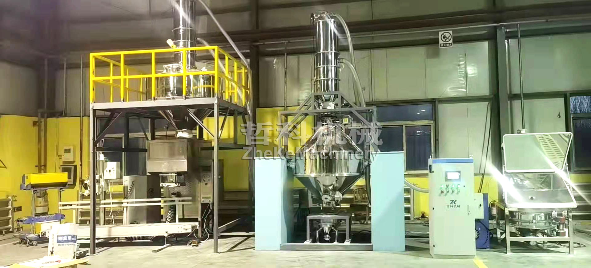 1、進料準備:投料前,混合機進料口自動上對齊,上對接系統(tǒng)自動對接好,實現(xiàn)密封,閥門自動打開,等待進料;