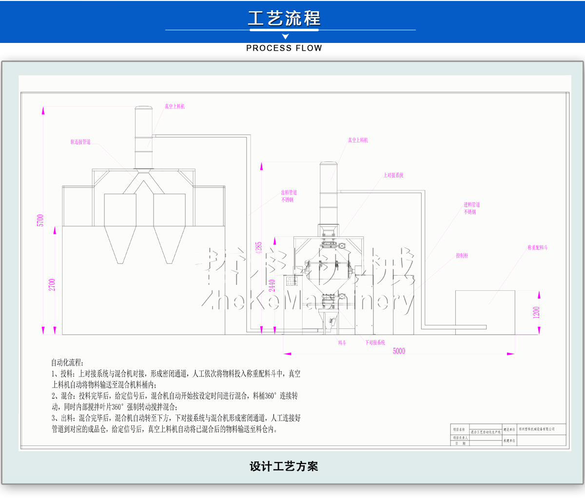 所有原料按配方配好后,開啟真空上料機,物料自動將待混合物料輸送到混合機料桶內(nèi),整個過程全密閉,無粉塵飛揚;
