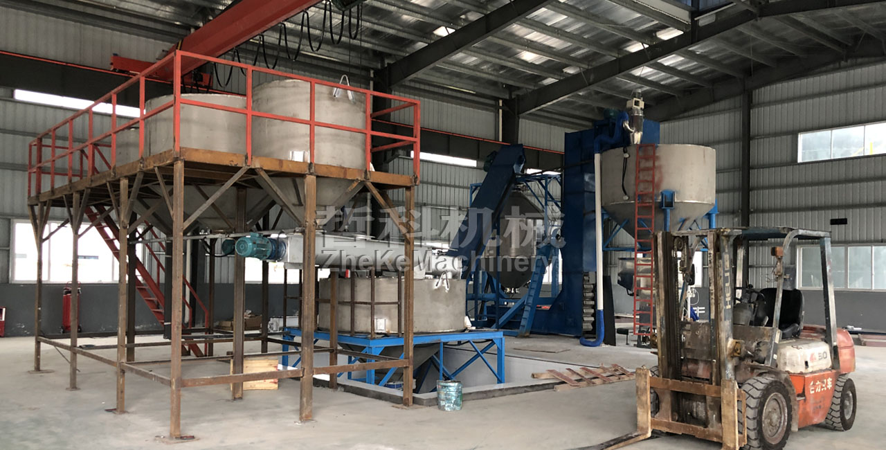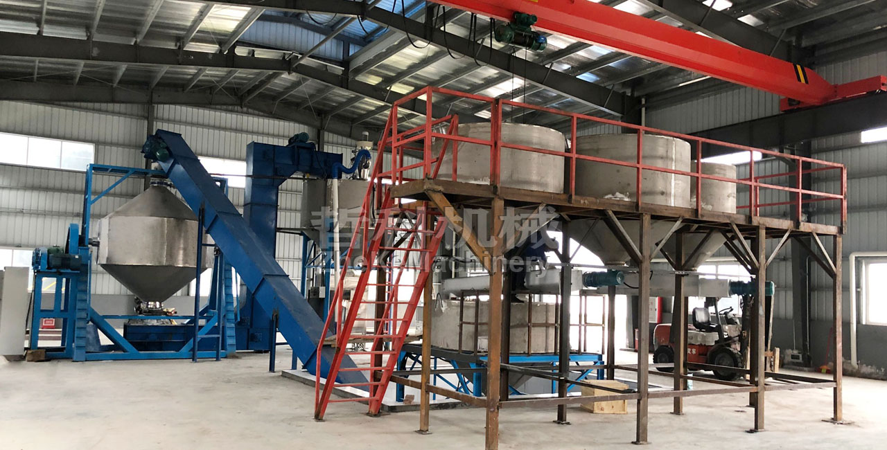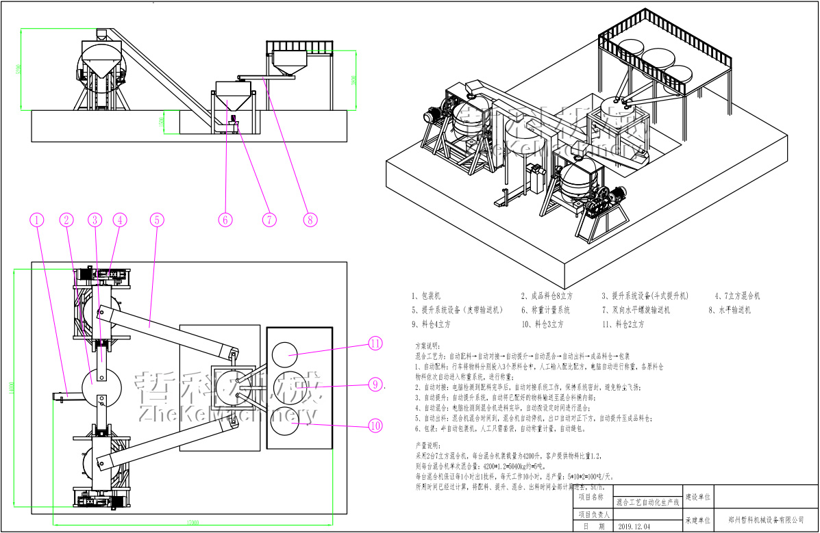 從原料倉開始,至最終產(chǎn)品25kg/袋,整個(gè)流程自動(dòng)化運(yùn)行,混合機(jī)每批次混合5噸/次,采用大型雙錐合批混合機(jī)7m3,自動(dòng)化程度高,全流程均采用密閉結(jié)構(gòu),防止粉塵飛揚(yáng),保持工廠潔凈生產(chǎn)要求,系統(tǒng)穩(wěn)定可靠,效率高。