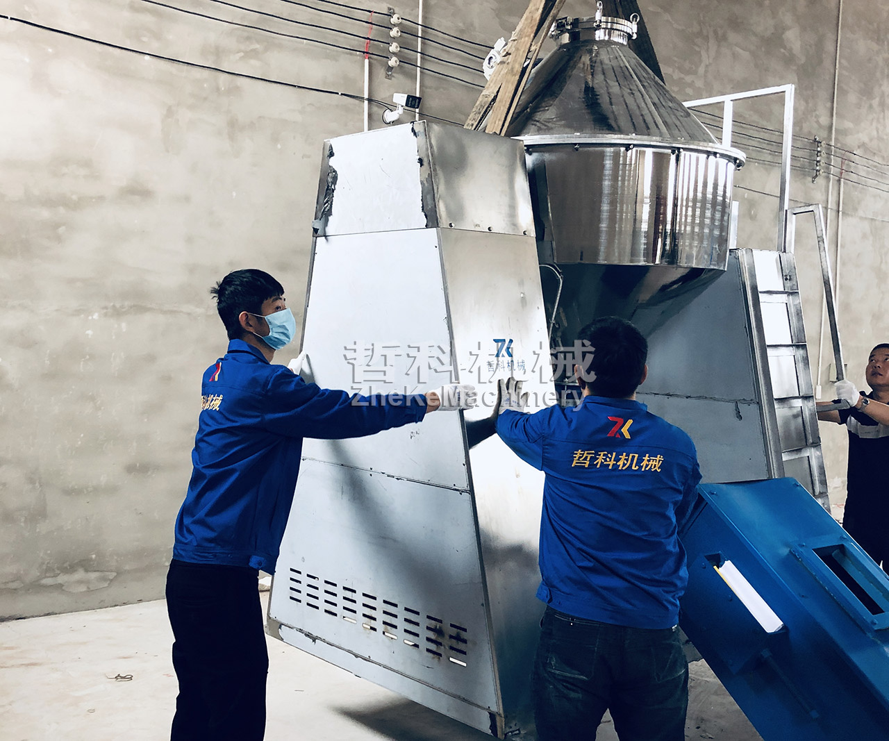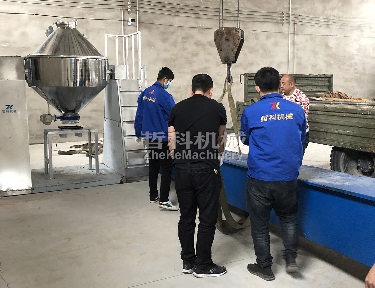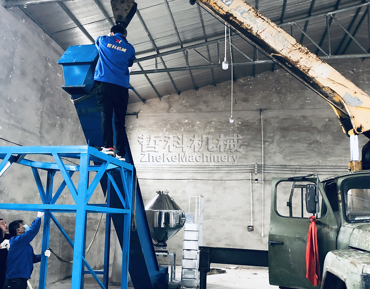 1、投料:該方案采用真空輸送機進行投料,將真空進料接口安裝到混合機上,開啟真空輸送機,再將物料投入真空輸送機料斗中,物料自動吸入混合機料桶內(nèi);