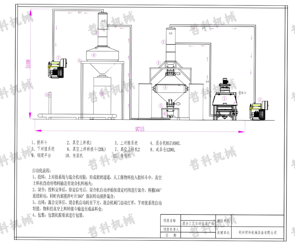 4, discharge: mixing time to, mixer outlet automatically under the alignment, the lower docking system automatically docked to achieve a good seal, receiving materials or subsequent process ready, the valve automatically opens, the material is transported to the finished product bin.