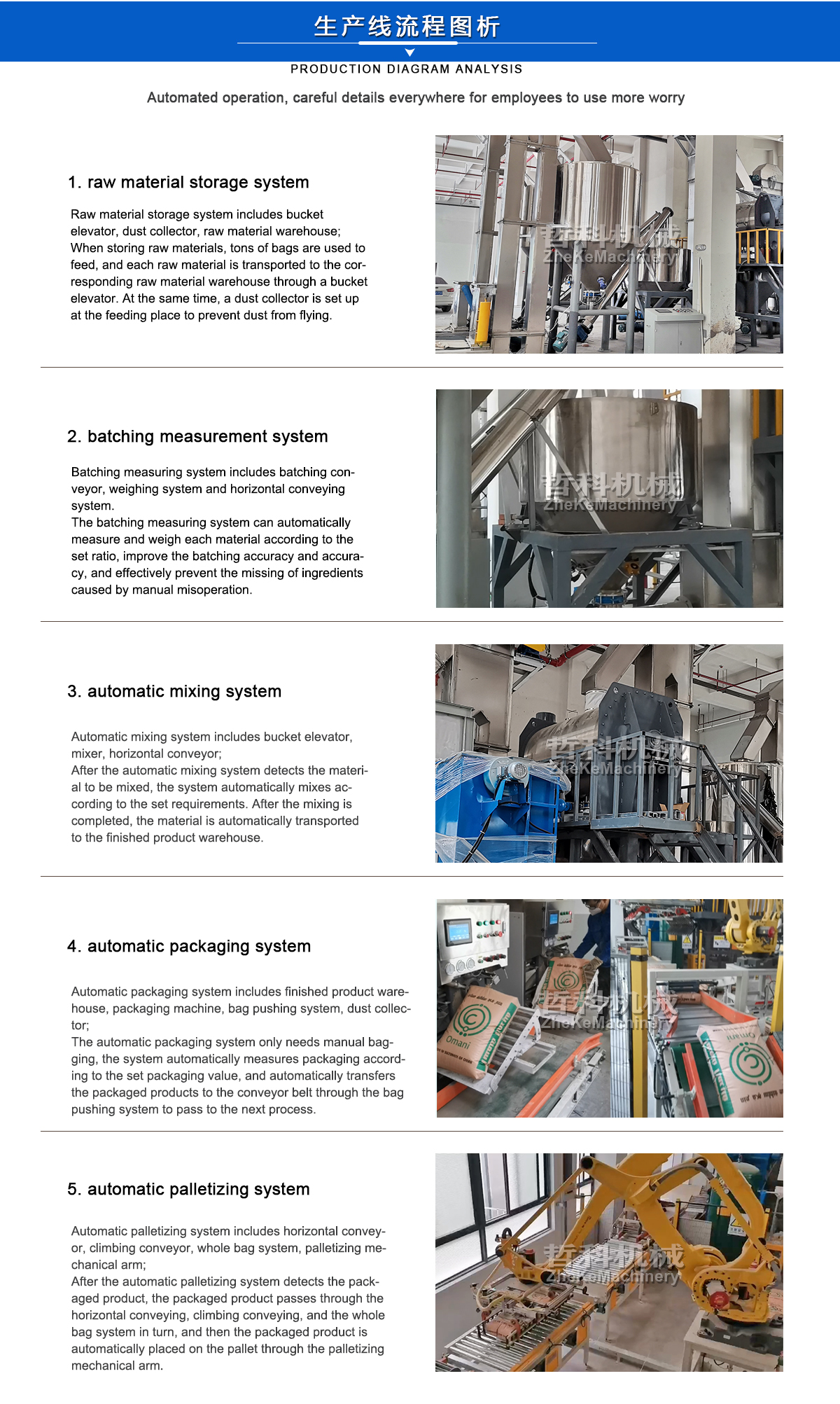 1. raw material storage system: including bucket elevator, dust collector, raw material warehouse; When storing raw materials, tons of bags are used to feed, and each raw material is transported to the corresponding raw material warehouse by bucket elevator. At the same time, dust collector is set in the feeding place to prevent dust from flying.